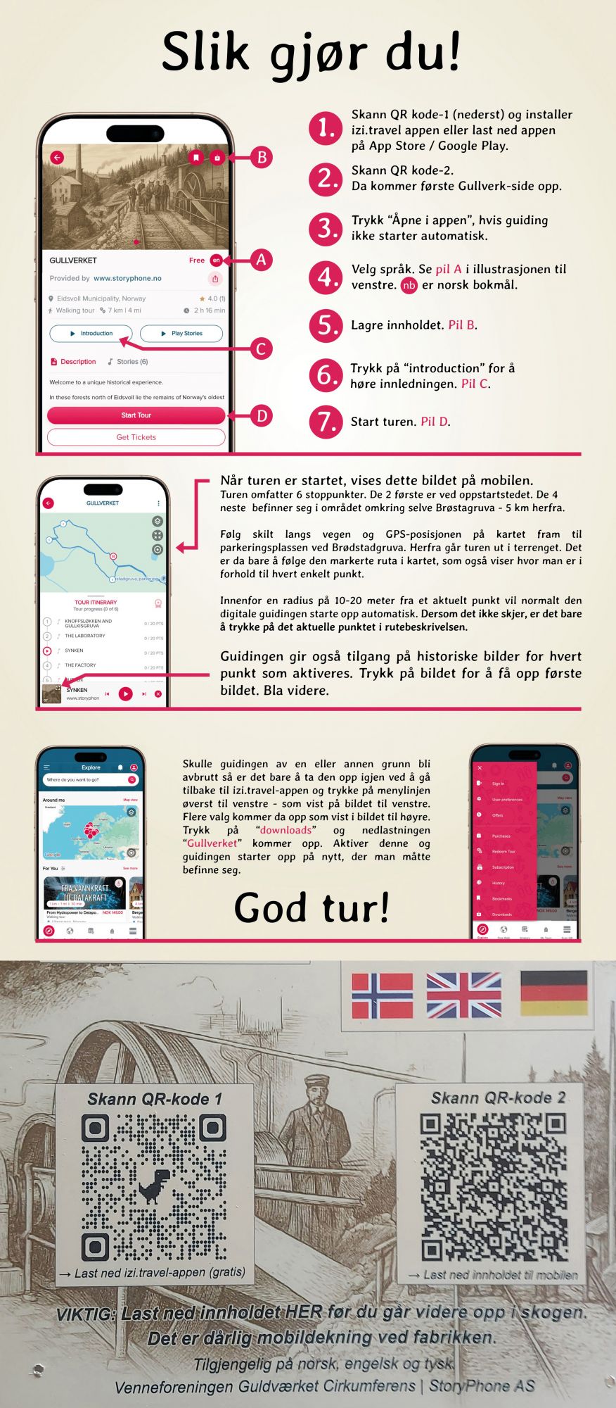 Nå kan du bruke mobiltelefonen som guide både ved Gullkisgruva, laboratoriet og på Brøstadgruva. Instruksjoner kan ses her.